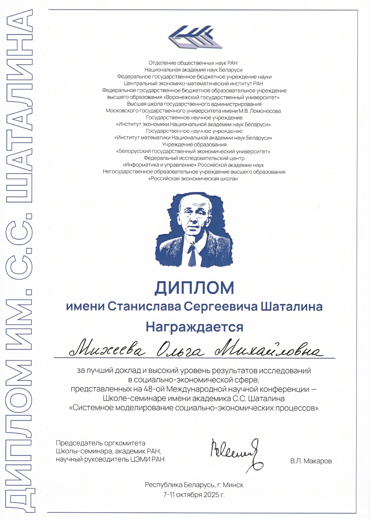 Выступление состоялось в рамках Международной научной школы-семинара имени академика С.С. Шаталина «Системное моделирование социально-экономических процессов», которая проходила в г.Минск 7-11 октября 2025 г.
