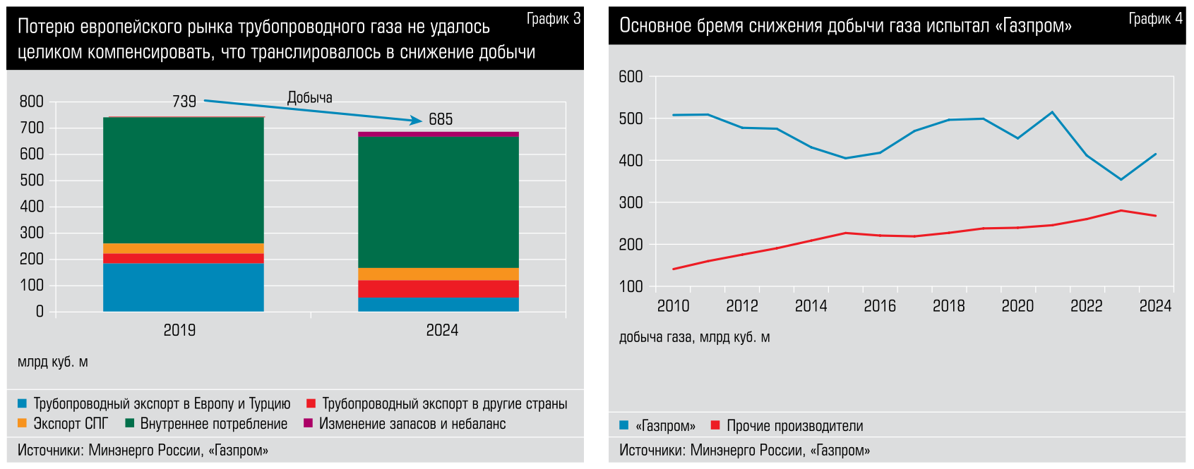 Как видно из приведенных цифр, полностью компенсировать отказ Европы от нашего трубного газа не удалось — снижение добычи в 2024 году по отношению к 2019-му оценивается в 65 миллиардов кубометров, или на 7–8 процентов. При этом подавляющая часть спада добычи пришлась на «Газпром», который выступил демпфером в этом вопросе.