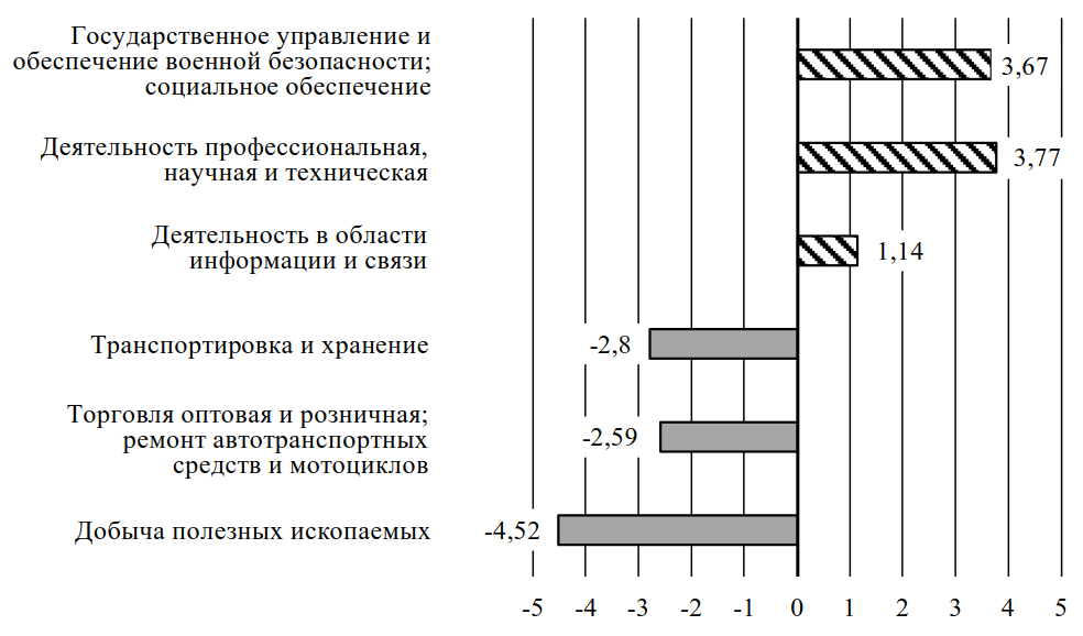 Рис. 2. Наиболее существенные изменения структуры инвестиций в основной капитал по крупным отраслям экономики России в 2023 г. по сравнению с 2018 г., п.п.