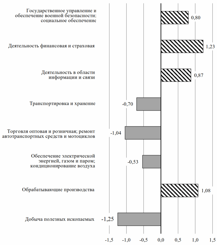 Рис. 1. Наиболее существенные изменения структуры валового выпуска по крупным отраслям экономики России в 2024 г. по сравнению с 2018 г., п.п.