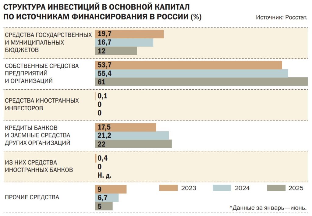 Однако перечисленных мотивов, пожалуй, недостаточно, чтобы объяснить, почему прирост инвестиций в основной капитал в России оказался почти в три раза выше, чем предрекало Минэкономразвития РФ в апреле 2025 года. Столь высокая инвестиционная динамика в условиях «экономического заморозка» стала возможной из-за следующих дополнительных факторов.