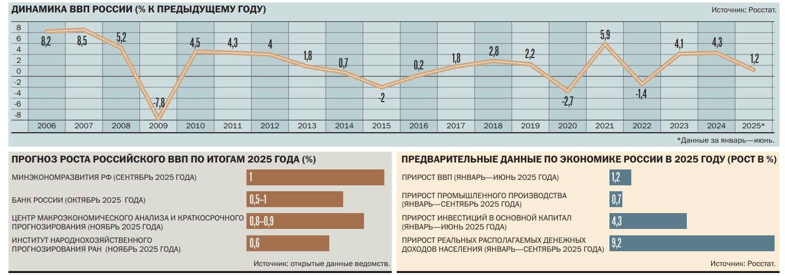 Существенное замедление экономического развития России можно считать свершившимся фактом. В соответствии со свежими прогнозами ведущих отечественных аналитических центров прирост российского ВВП по итогам 2025 года составит не более 0,5–1%. Напомним, что в 2023 году российский ВВП вырос на 4,1%, а в 2024 году — на 4,3%. Апрельский прогноз Минэкономразвития РФ, предрекавший на 2025 год прирост ВВП в 2,5%, был более оптимистичным по сравнению с сегодняшними данными.