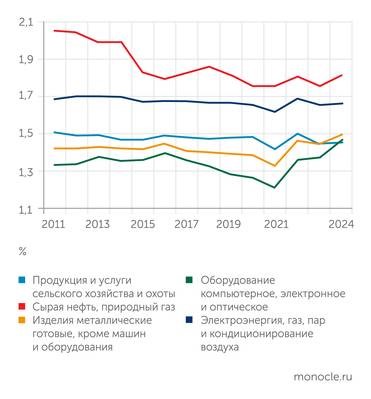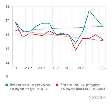 В то же время есть сектора, в которых в 2011‒2024 годах издержки, связанные с использованием первичных ресурсов, возрастали. Прежде всего это химическая промышленность и металлургия. С одной стороны, это связано с происходившими структурными изменениями в экономике, когда возросла роль отраслей, потребляющих металлы и химическую продукцию. С другой стороны, свою роль сыграла сложившаяся система ценообразования в этих секторах на основе экспортного паритета, когда значительная часть продукции реализуется на внутреннем рынке по ценам, учитывающим мировые ориентиры. Соответственно, рост затрат на первичные ресурсы в этих секторах отражает как реальные технологические и структурные сдвиги, так и особенности ценовой политики.