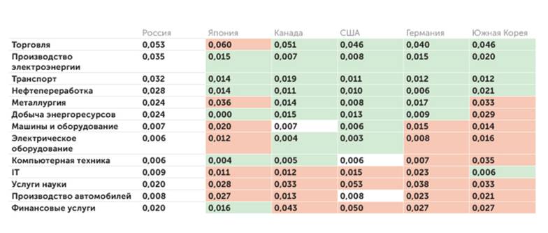 Отношение суммарных затрат в экономике на продукцию представленных отраслей к полному выпуску (красный — значения больше, чем в России, зеленый — меньше, чем в России)