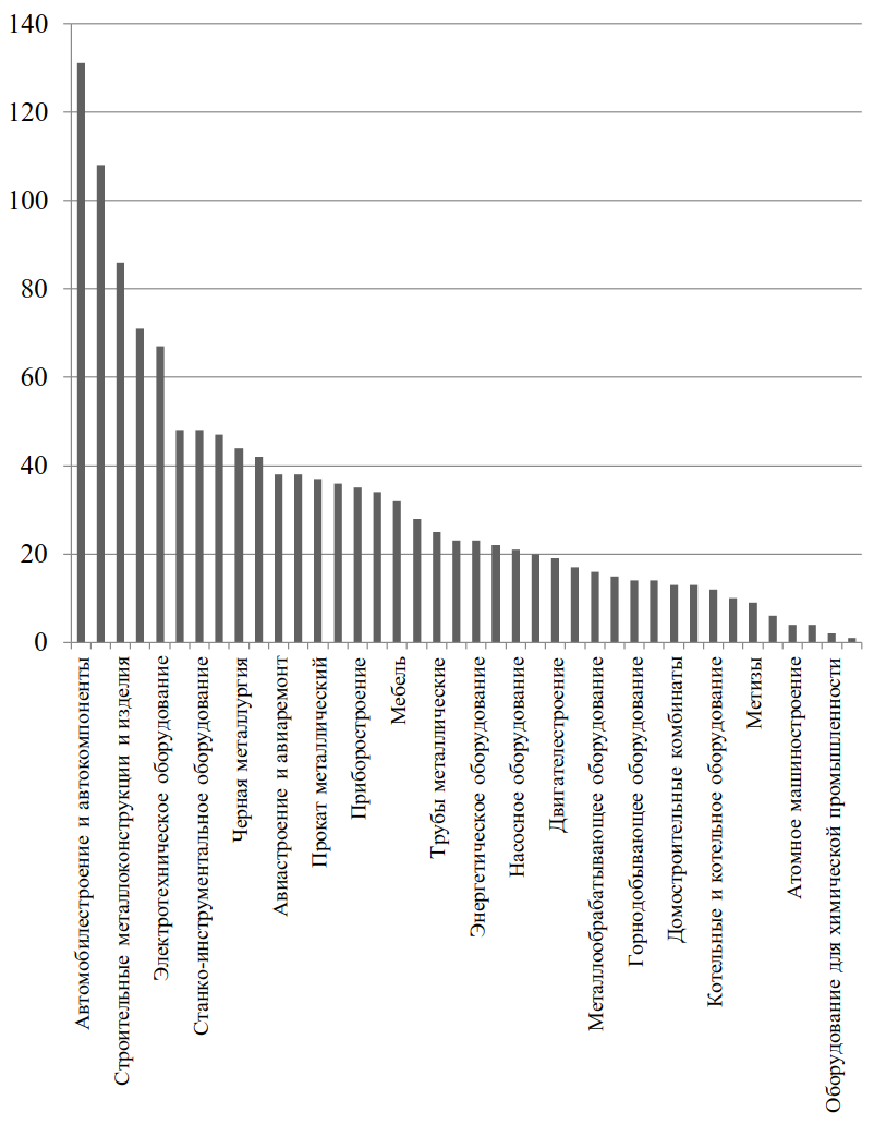 Рис. 2. Количество инвестиционных проектов в отраслях, формирующих спрос на черные металлы и металлопродукцию, в России, шт. (по состоянию на начало 2025 г.)