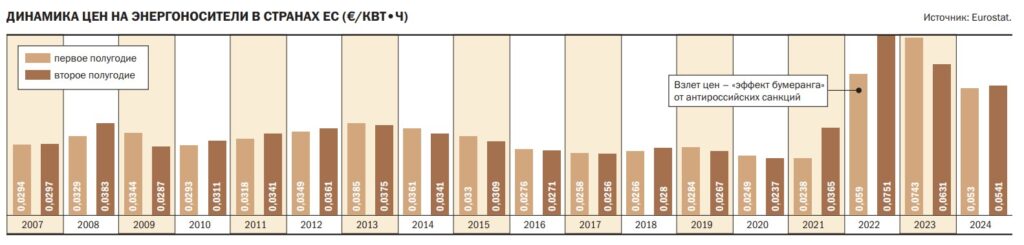 Рост цен на природный газ, вызванный санкциями, вступившими в силу в первой половине 2022 года, стал катастрофическим для экономики ЕС. Ведь именно цены на газ определяли общий уровень цен на европейском рынке энергоносителей. За первые три года, в течение которых действовали санкции (2022–2024), цена на газ выросла в 2,35 раза по сравнению со средней ценой за три года, предшествовавших кризису COVID-19 (то есть в 2017–2019 годах). Европейские страны потребляют очень значительные объемы природного газа в промышленных целях, будь то в качестве источника энергии (для производства электроэнергии, а также для металлургии и выплавки стали) или в качестве сырья для химической промышленности. Прямой ущерб от роста энергетических цен в данном случае очевиден. Но существует еще и косвенный ущерб, который экономисты называют «эффектом второго порядка». Повышение цен на газ влияет на домохозяйства через цены на электроэнергию и отопление. Резкий рост цен на газ, наблюдаемый в Европе с первой половины 2022 года, фактически сокращает доступные денежные средства, необходимые домохозяйствам для других видов потребления.