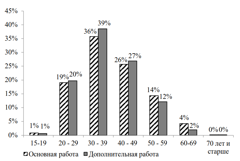Согласно данным Росстата за 2023 г. численность занятых в платформенной экономике составила 3,4 млн чел., при этом доля платформенно занятых на основной работе равнялась 95%, на дополнительной – 5%. Можно предположить, что статистика Росстата недостаточно полно отражает дополнительную занятость, так как другие исследования [3] дают оценки платформенной занятости в 16,9 млн чел., большая часть из которых (78%) — это дополнительно занятые. Наши расчеты свидетельствуют о 4,5 млн чел., занятых в платформенной экономике в 2023 г.