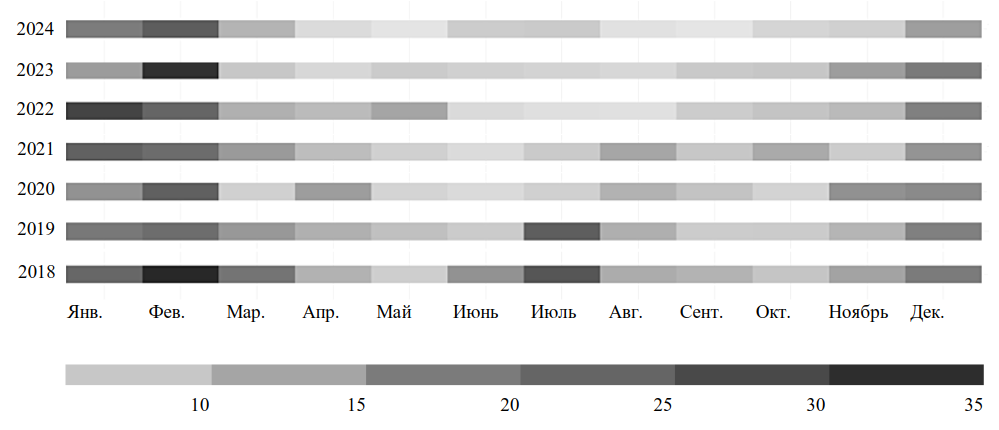 Рис. 1. Средние концентрации загрязняющих веществ PM2.5 в Красноярске, 2018–2024 гг., мгм/м3