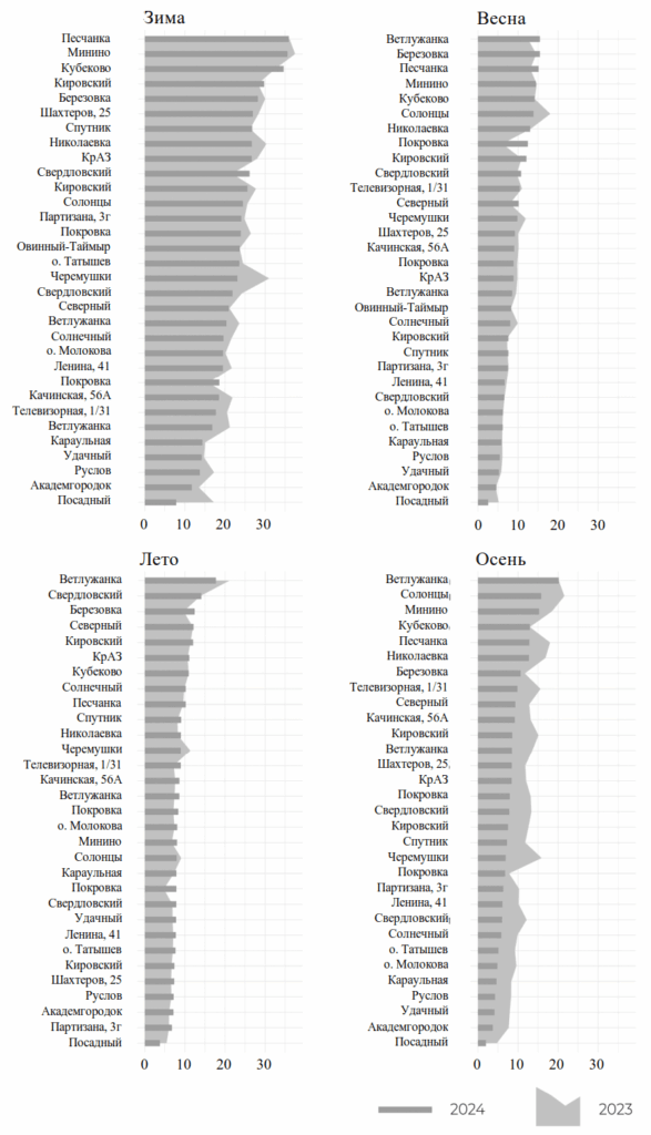 Пространственно-временные различия. Сравним структуру пространственного загрязнения в 2024 и 2023 годах (Рис. 2). Можно заметить общее снижение уровней загрязнения в осенний период, и увеличение в летний период 2024 года. Данное наблюдение актуально для 2024 года относительно прочих лет наблюдений в короткой ретроспективе. В зимний период различия в уровнях загрязнения незначительны, наиболее грязные территории сохраняют свои позиции, снижение загрязнения для них не наблюдается. В холодные сезоны наблюдается наибольшая дисперсия уровней загрязнения: увеличение уровней происходит преимущественно на периферийных территориях города.
