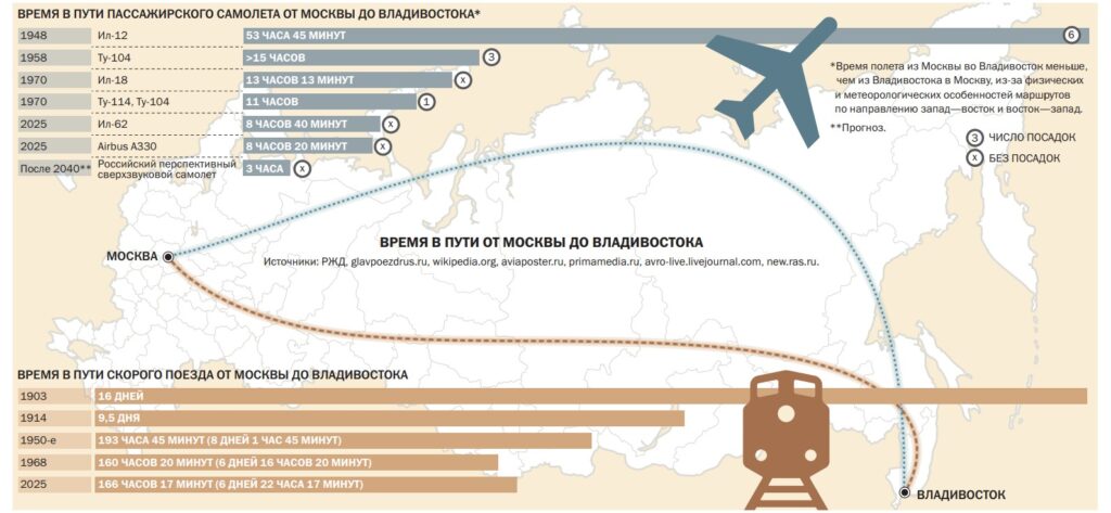 С этой точки зрения я бы предложил в первую очередь обратить внимание на транспортные проекты прорывного характера, создающие возможности, которых не было раньше. Возьмем, например, сюжет со временем поездки из центра России на Дальний Восток. За последние 150 лет принципиальное улучшение ситуации здесь наблюдалось только дважды. Первое революционное изменение произошло в начале XX века, когда был проложен сквозной железнодорожный путь до Владивостока и время поездки из центра России к ее восточным границам сократилось с двух-трех месяцев до девяти-десяти дней. Второй прорыв случился в 1950-х годах, когда было налажено регулярное авиасообщение с использованием турбовинтовых и реактивных самолетов и когда для любого жителя страны стало возможным попасть из Москвы во Владивосток чуть больше чем за полдня. С тех пор наблюдались лишь небольшие улучшения, которые позволили сократить время железнодорожной пассажирской поездки до 6,5–7 дней, а время полета – до 8,5–9 часов. А примерно с 1970 года время поездки на Дальний Восток вообще перестало сокращаться.
