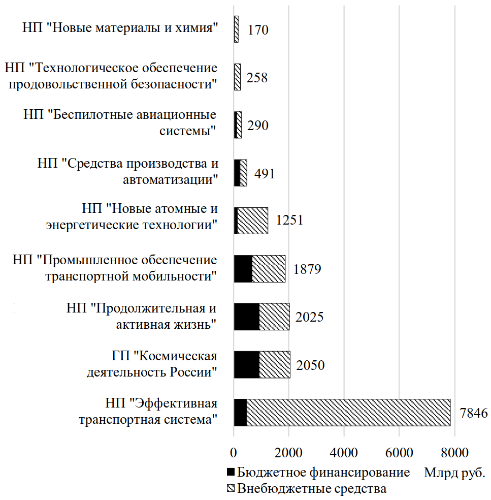 Правительство РФ в определённой степени осознает необходимость мобилизации наличных ресурсов, что видно по его усилиям сконцентрировать приоритетные направления научно-технологического развития (НТР) в новой организационной и финансовой форме – «национальные проекты» (НП), которые будут иметь смешанное (т.е. и внебюджетное) финансирование. Планируемые объемы финансирования восьми НП «технологического лидерства» на 2025-2030 гг. показаны на Рис. 1.