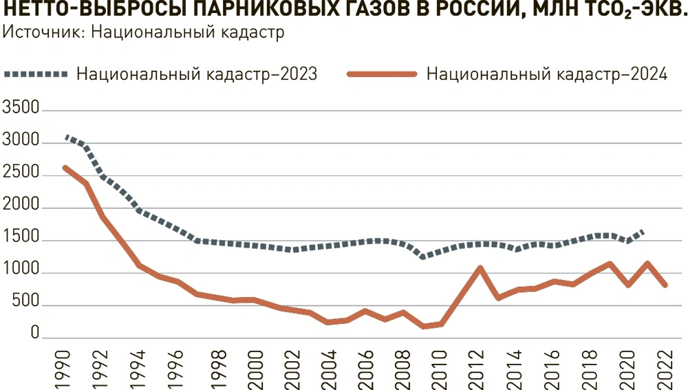 Но прежде несколько слов по поводу масштабов наших выбросов парниковых газов. Да, Россия большая страна, и мы входим в число крупнейших эмитентов парниковых газов. Но недавно российские ученые уточнили официальные значения выбросов России. Был разработан новый Национальный кадастр баланса выбросов-поглощений парниковых газов, в котором при расчетах применялись не рекомендуемые международные коэффициенты и методы, а наши собственные. И оказалось, что Россия выбрасывает почти в два раза меньше, чем считалось ранее. Вместо 1,6 млрд тонн СО2-эквивалента в реальности это 0,8-1,1 млн тонн в разные годы. А значит, достижение углеродной нейтральности потребует гораздо меньше денег. Экономический эффект от такой коррекции по самым скромным оценкам составляет около 6 триллионов рублей.
