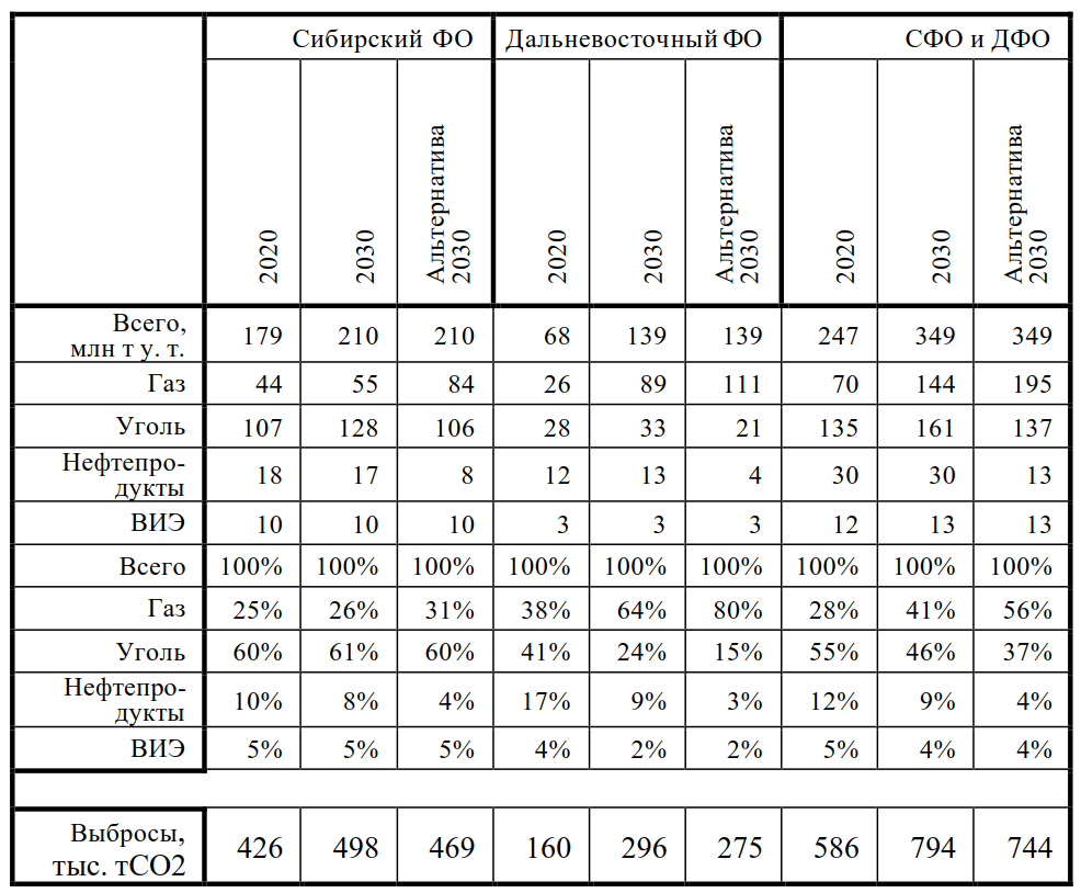 Были рассчитаны два сценария энергоснабжения ВС и ДВ до 2030 г. (табл. 1). Согласно базовому сценарию, который во многом опирается на представления самих регионов о развитии энергоснабжения в них, ожидается рост доли природного газа в структуре потребления с 28% до 41%, сокращение долей угля с 55% до 46%, нефтепродуктов с 12% до 9% и ВИЭ с 5% до 4% к 2030 г. Все это ведет к увеличению выбросов СО2 на 35% до 794 тыс. т к 2030 г.